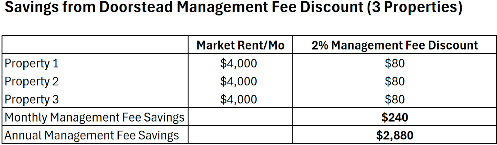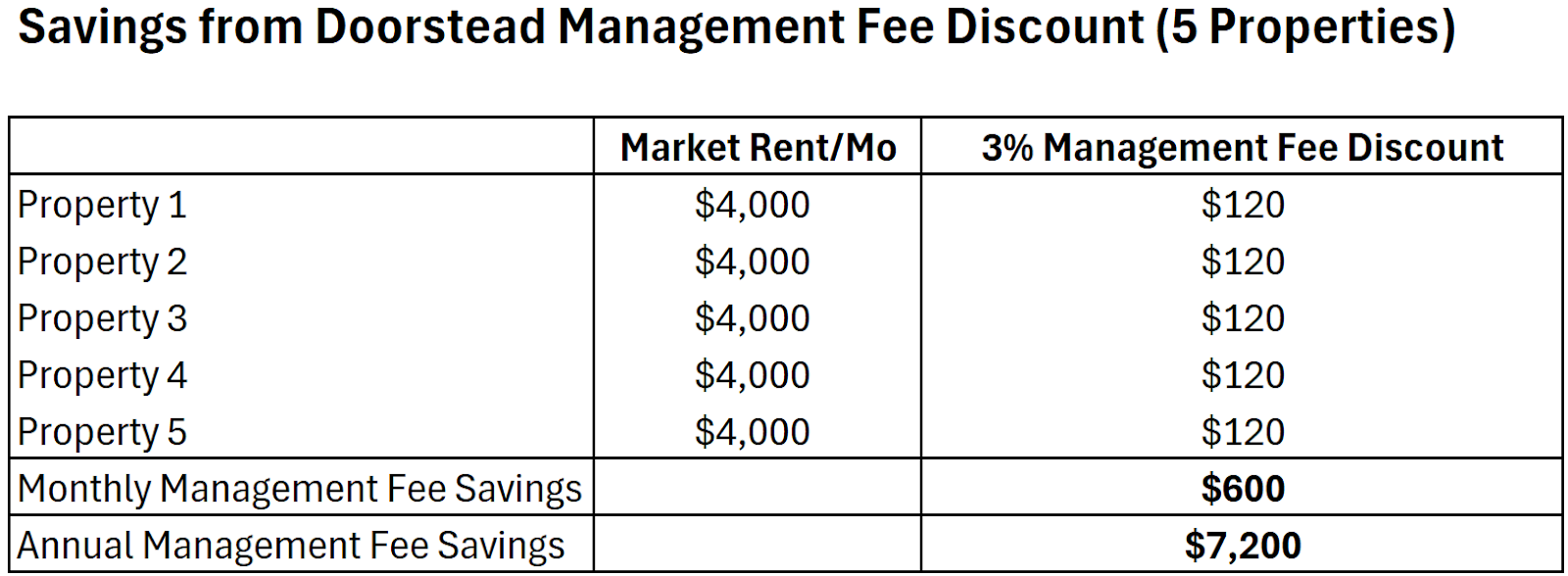 In another example, the Doorstead’s fee discount program translated to the owner with 5 units paying a 5% fee compared to the industry average 8% fee, a $7,200 in recurring annual savings for an owner with 5 properties.