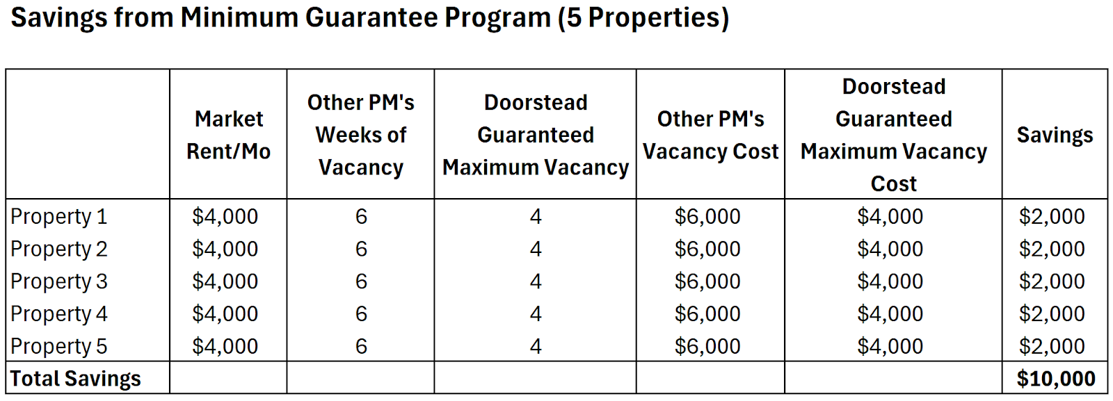 This results in $6,000 in annual savings from Doorstead’s minimum guarantee program for an owner with 3 properties.